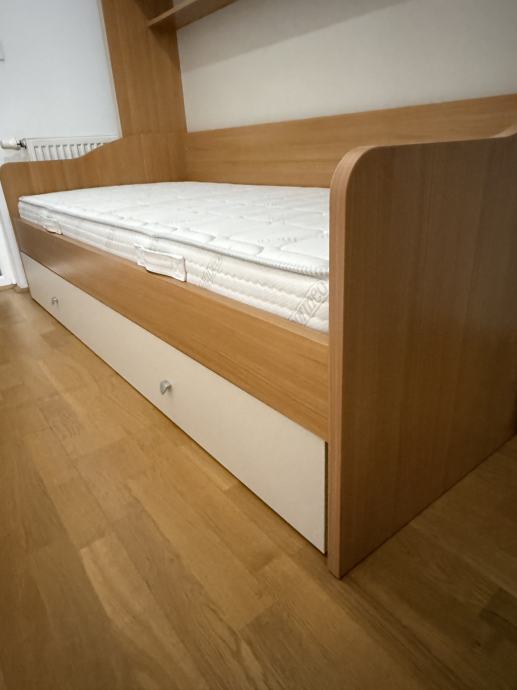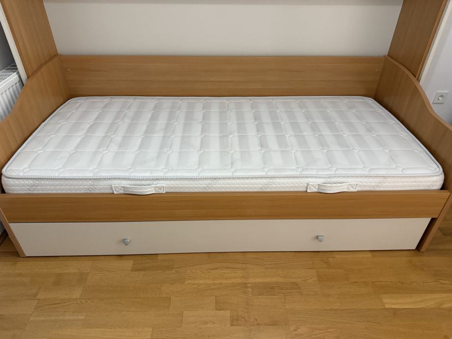 Prodamo enojno posteljo 90x200cm z dodatno izvlečno posteljo, ki nudi dodatno ležišče za goste mere 80x190cm. Barva: bela/natur. Zraven sta oba posteljna dna oz. letvena dela. Zraven še 2x kot nov Dormeo jogi (dimenzije 200x90 in 190x80 cm). V kompletu tudi most z visečimi omaricami nad posteljo (dolžina 205 cm, višina 230cm). Izdelano po meri pri mizarju (masiva). Dobra rešitev za manjši prostor, goste in počitniške kapacitete. Prevzem možen v Kranju.
