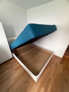 Rabljena, lepo ohranjena postelja z dvižnim ležiščem in predalom za shranjevanje.