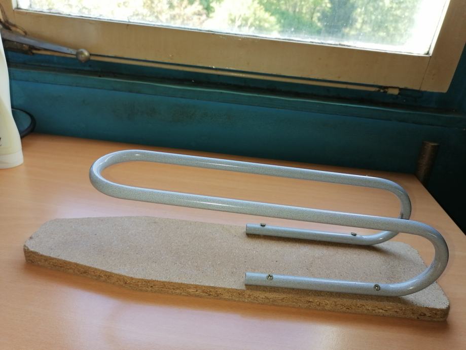 in še kaj malega.Je iz kovine sive barve in lesa.Njene mere:stojalo je iz sive kovine,deska iz lesa.Njene mere:dolžina 45cm,višina 11,5cm.Odlično ohranjena.Tel.064 222 880,osebni prevzem.