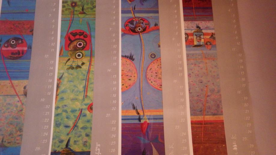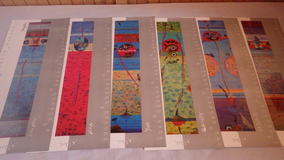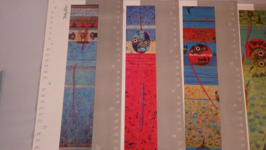 Pokončna pokrajina iz cikla pravljičnih pajsažev na foliji velikosti 10 x 54 cm.