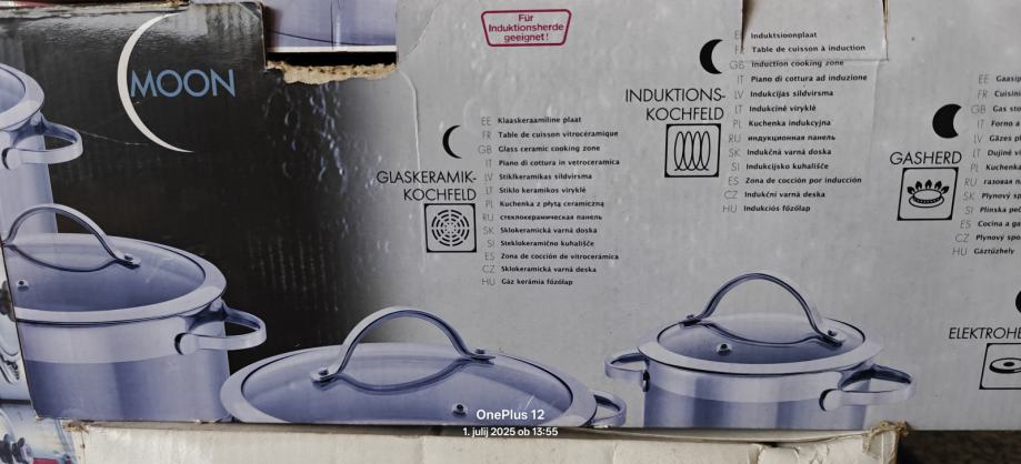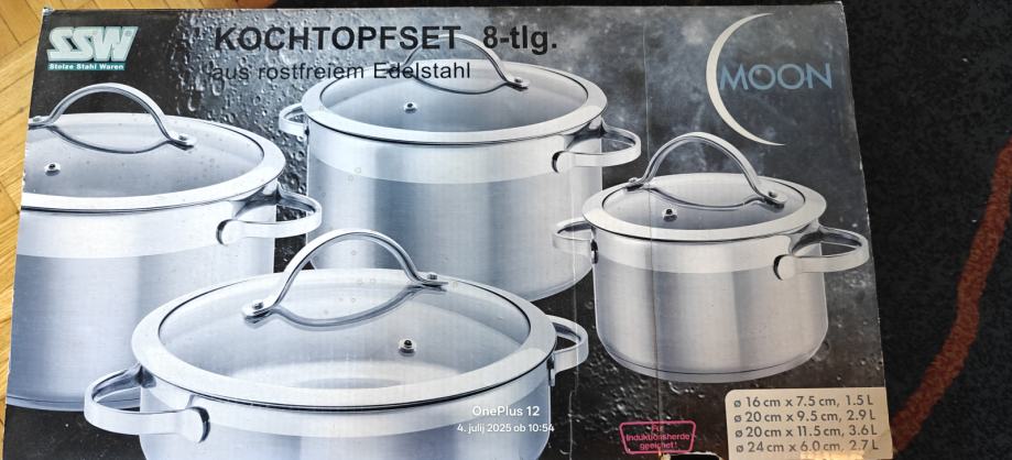 Prodam popolnoma nov in nerabljen 8-delni komplet kuhinjske posode SSW – Moon, iz kakovostnega nerjavečega jekla. Komplet vsebuje 4 lonce različnih velikosti s pripadajočimi steklenimi pokrovi.