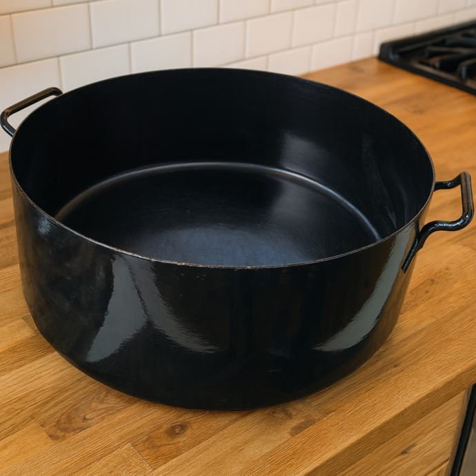 Prodajam rabljeno črno emajlirano ETERNA kozico odlične kakovosti z dvema ročajema za enostavno prenašanje. Primeren je za različne načine kuhanja in je kljub uporabi še vedno v dobrem stanju. Posoda drži 50 litrov (visoka je 21cm, široka je pa 56cm).