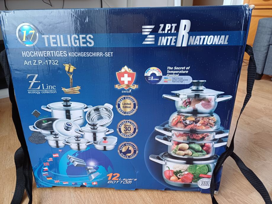 Set posod proizvajalca Z.P.T. International. 1 večji lonec, 1 srednji, 2 manjša, nizka posoda z non-stick površino, odcejalnik, 2 podlogi,... Nerabljeno, v originalni embalaži. Možen samo osebni prevzem v Ljubljani (Vič), piši na: anja.pavlin1@gmail.com
