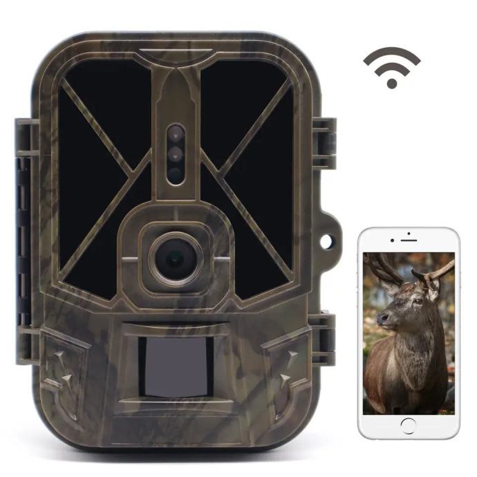 WIFI kvalitetna vrhunska vodotesna lovska kamera 30MP, snema v UHD ločljivosti 4K. Vgrajen ima senzor gibanja, ki zazna gibanje pred kamero. Gibanje zazna do 15-20 m daleč. Čas proženja kamere je 0,2 sekunde. Vidni kot snemanja je 120 stopinj. Ko kamera zazna žival, avtomatsko naredi video posnetek dogajanja in tudi slike živali na Sd kartico. Posnetke in slike lahko pogledate na 2,4 inch monitorju, ki je vgrajen v kameri ali jih prenesete na vaš računalnik. Kamera ima tudi nočni vid, saj ima vgrajene nevidne IR diode, ki razsvetlijo vidno polje kamere. Kamera ima že vgrajeno polnilno baterijo 10000mA, ki v pripravljenosti vzdrži do 6 mesecev. Priložena podrobna slovenska navodila za nastavitev kamere, garancija, podatkovni kabl za prenos slik na pc in polnilec za polnjenje baterije 220V. Kamera ima možnost montaže na drevo(priložen pas za pritrditev) ali da se obesi.