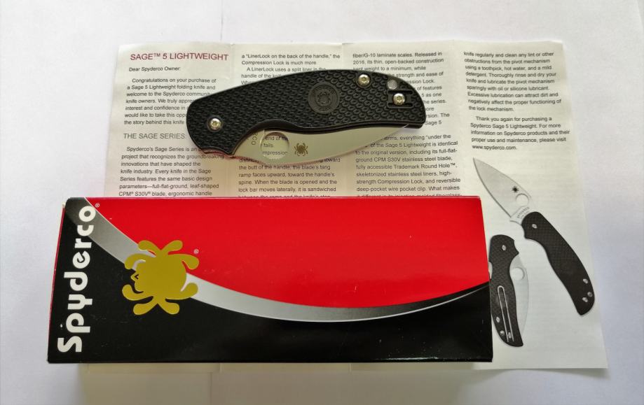 Prodam odlično ohranjen, kot nov nož Spyderco Sage 5 Ligtweight. Rezilo je izdelano iz CPM S30V jekla, ročaj pa iz FRN (fiberglass-reinforced nylon) s kovinskimi ojačitvami. Nož je kljub temu, da je lightweight, zelo robusten in trpežen. Rezilo je centrirano na sredino, zelo natančno nabrušeno in brije. Nož je brez napak.