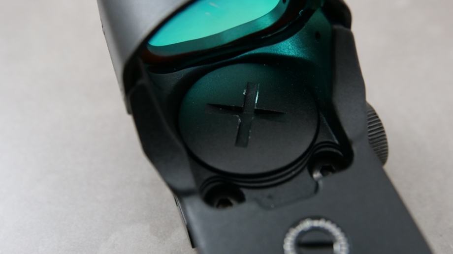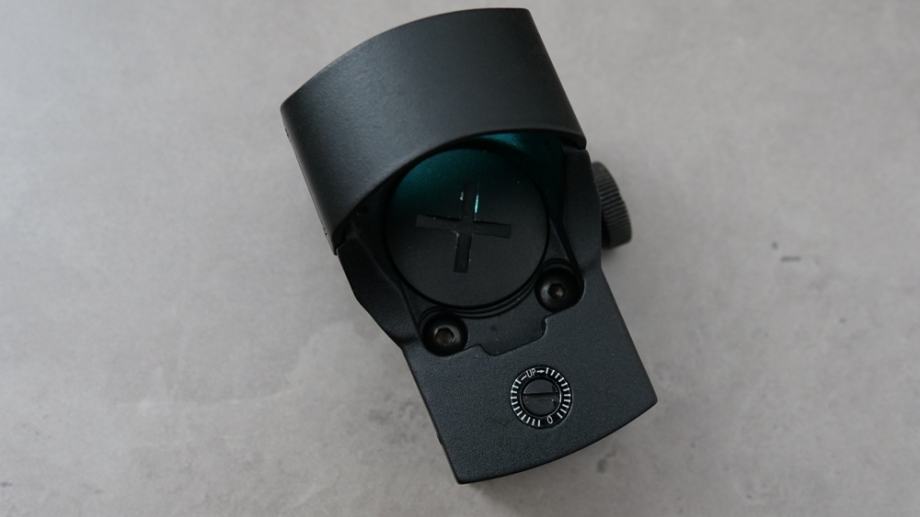 Ade Advanced Optics RD3-011 rdeča pika ima minimalne zunanje znake uporabe in majhno prasko na pokrovu baterije.