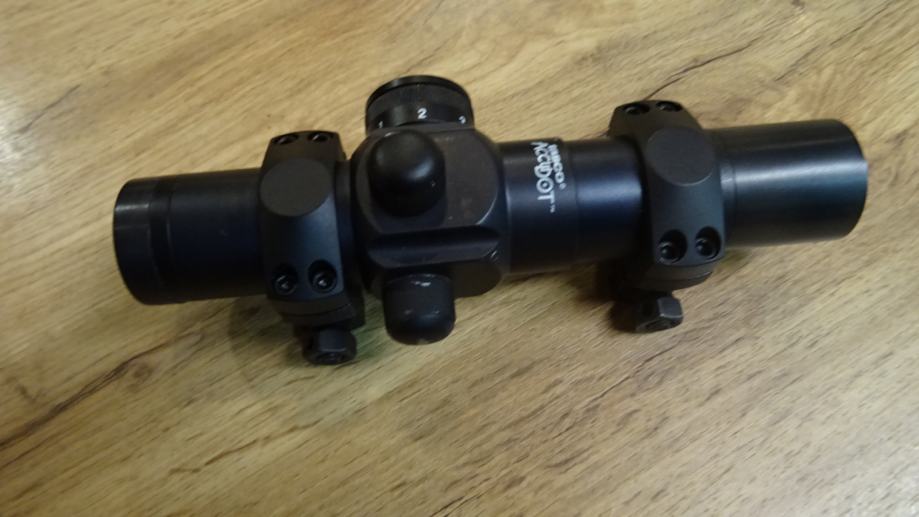 Profesionalna rdeča pika višjega kvalitetnega razreda znamke Tasco ACCUDOT in ni ceneni kitajski ponaredek. Več stopenj osvetlitve, za hitro streljanje, pogne, široko vidno polje. Zraven optike pripada tudi montaža iz slike za montažo na Waver Picatiny 22 mm montažno letev.