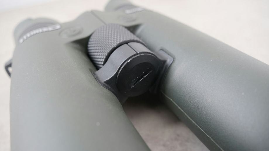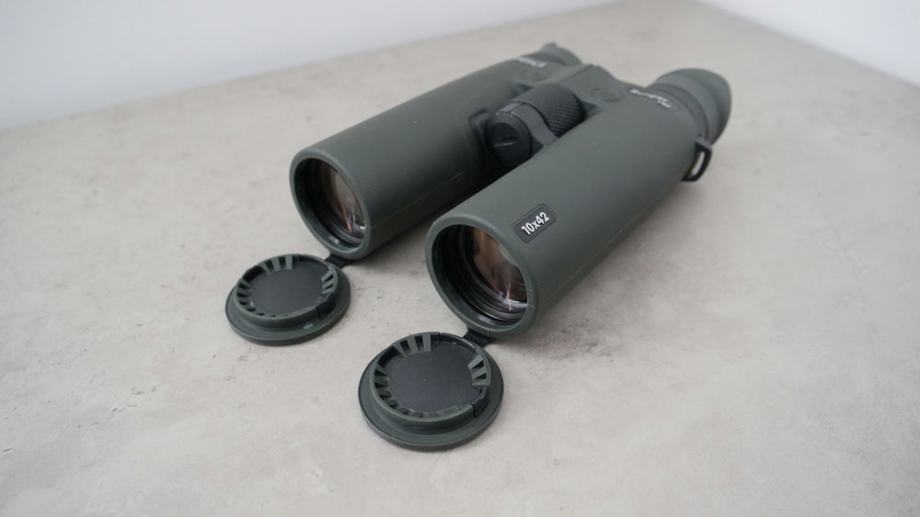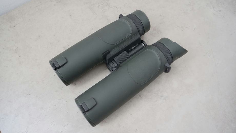 Steiner Ranger LRF 10x42 daljnogled ima opazne znake uporabe na terenu, kar je razvidno iz prask na baterijskem pokrovčku. Prodaja se brez originalne embalaže, paket vključuje le daljnogled in pokrovček za okular, brez drugih dodatkov. Izdelek je popolnoma funkcionalen.