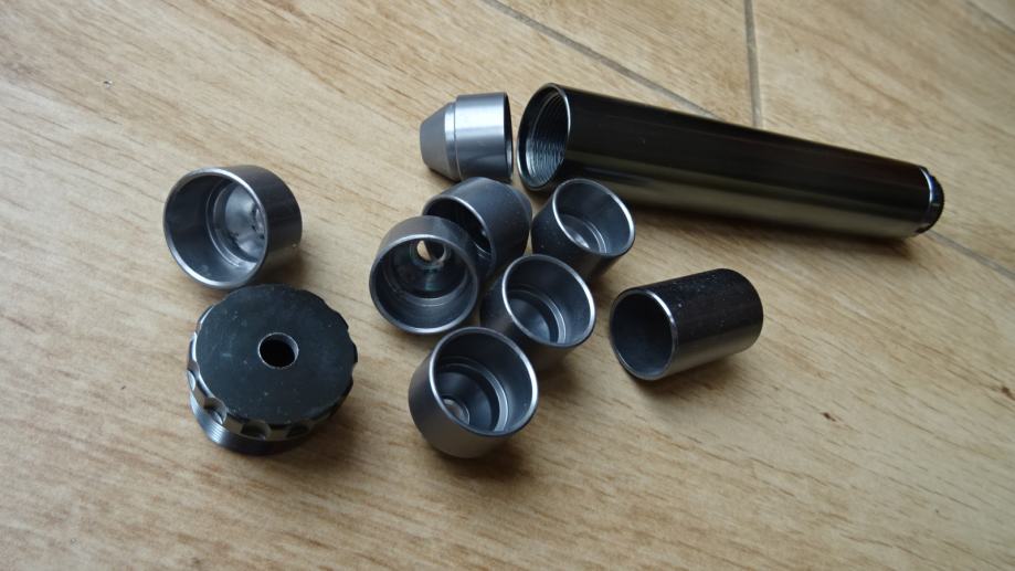 Prodam dušilec iz slike za orožje kalibra 17 HMR ali 22 LR - 5,6 mm. Dušilec je najvišje kvalitete in ne vsebuje nič plastičnih delov kot ostale nizkocenovne verzije. Je modularni, in najbolje duši, saj ima kar 7 prekatnih kovinskih komponent - ostali imajo največ 5 komponent! Je modularni, se enostavno razstavi in omogoča popolnoma enostavno čiščenje in za čiščenje ne potrebujete kupovati posebnega dragega čistilca za dušilce kot je popotrebno pri modelih, ki ne omogočajo razstavitve! Dušilec je nerabljen, dobljen v menjavo za strelni daljngled. Z novim zakonom o orožju ne gre več za prepovedano predmet prodaje in je v prosti prodaji v trgovini, prodam pa ugodno samo lovcu ali strelcu z orožo listino!