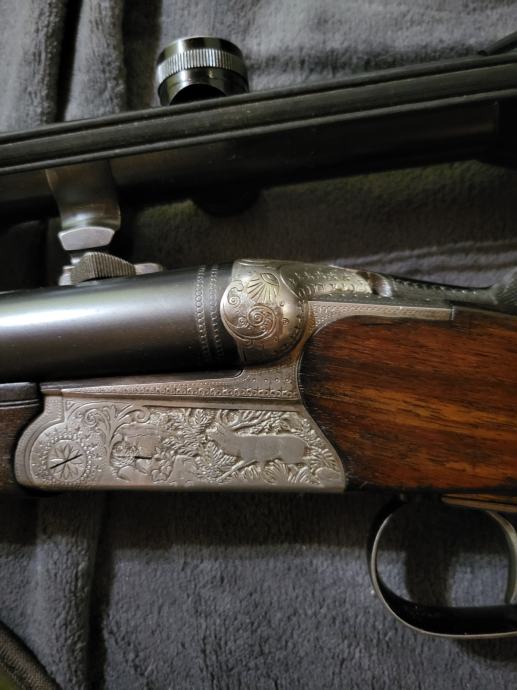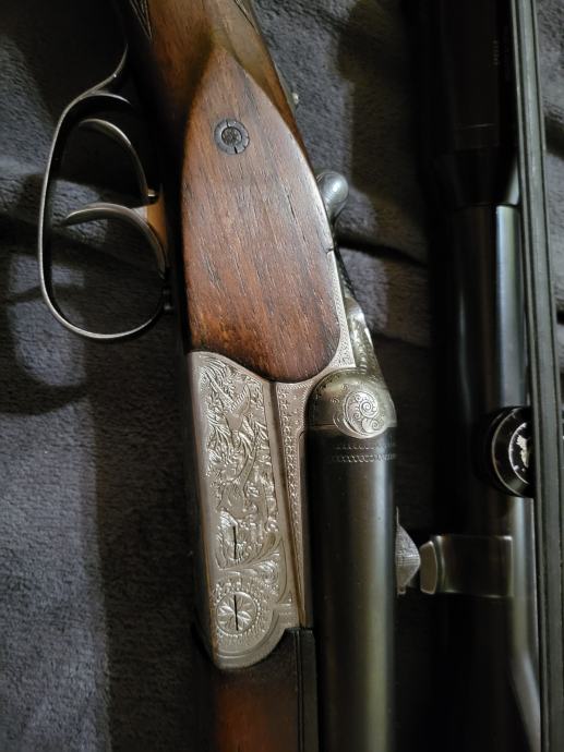 2. Driling Merkl Suhl luxus, svetla glava z gravurami, kalibru 7x65R, 12/12, na njem obnovljen v tovarni svarowski 6x42 4a križ. Cena 1400€