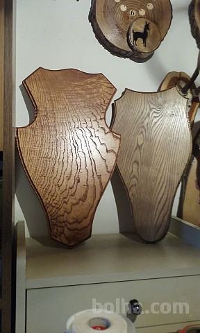 Prodam podloge za lovske trofeje rogovje jelena. Podloge so velikosti 52 x 28 in 48 x 24 cm. Narejene so iz masivnega lesa, debelina 25 mm. Lokacija: Spodnje Jarše, Jelovškova 9, Domžale. Lahko po pošti pošljem. Tel. 070 493 121.