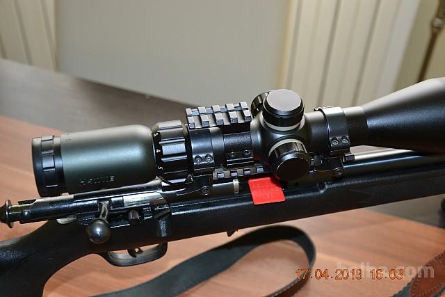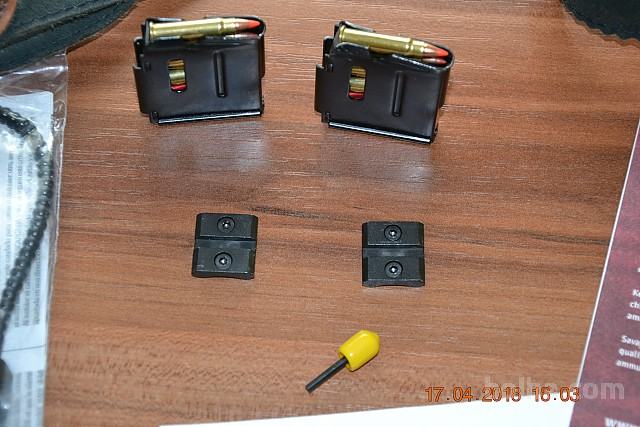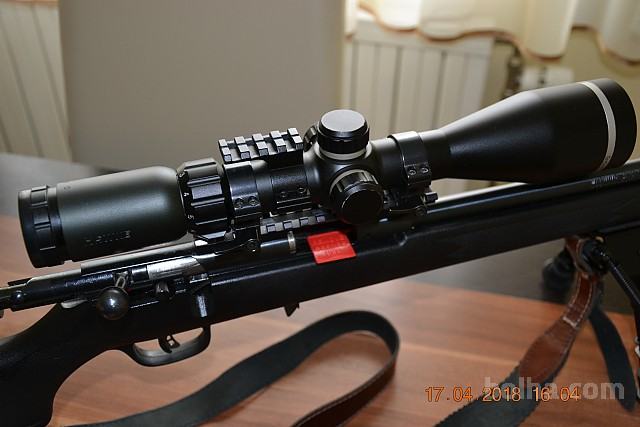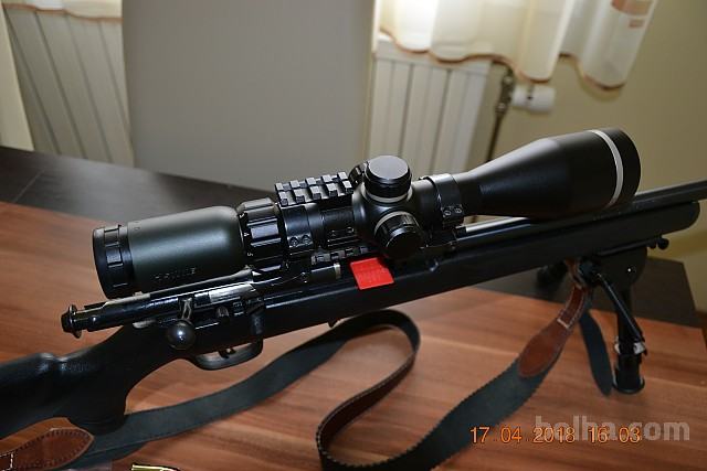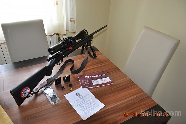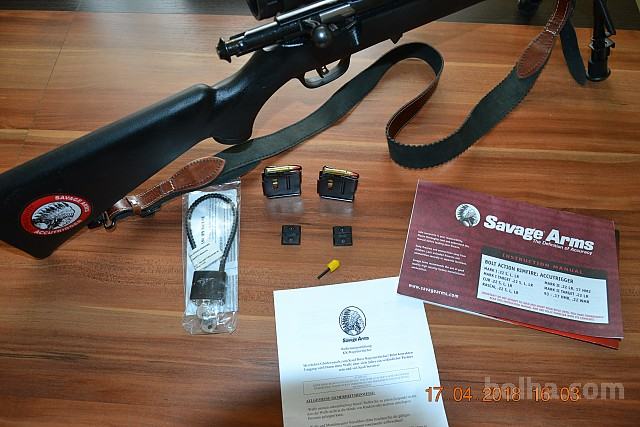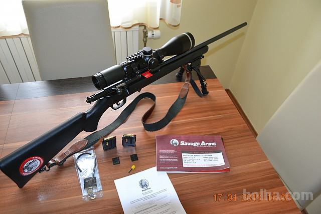 Zaradi neuporabe prodam zelo malo rabljeno puško SAVAGE 93R 17 HMR. Na puški je montiran strelni daljnogled HAWKE Vantage 4-12-x50. Daljnogled je montiran s hitro snemljivo montažo na original Picantiny letvi. Dodana sta dva mostička prav tako original za montažo (spodnji del). Na daljnogledu je krajša snemljiva Picantiny letev za piko ali za svetilko. K puški pripadata tudi dva nabojnika, kapacitete pet nabojev. Puška ima tudi dodane strelne nogice, ki se lahko podaljšajo (snemljive). Zraven je pas za puško in varnostna ključavnica - original. Gre za repetirno puško (C1).