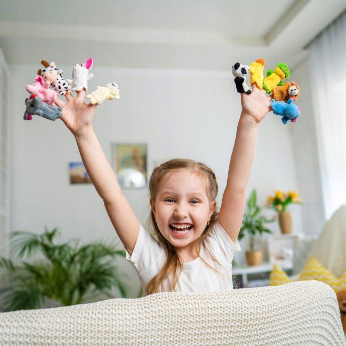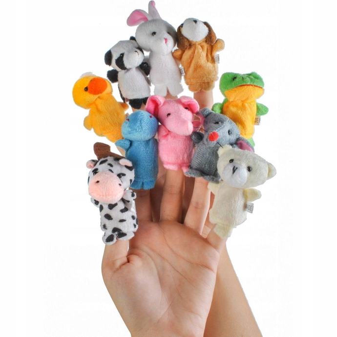 Komplet je sestavljen iz 10 zelo lepih lutk-živali, ki se prilegajo vsakemu prstu roke in.Zahvaljujoč dejstvu, da lahko za igro uporabljamo vse prste, se njegova privlačnost poveča, gledališče pa je bolj zanimivo in daje priložnost za razvoj zgodba. Z lutkami se lahko igrate v večji skupini ne samo z roko, temveč tudi na primer s svinčnikom ali barvicami. V kompletu so živalski liki kot so: povodni konj, raca, zajec, panda, pes, medvedek, miška, slon, žaba in krava.