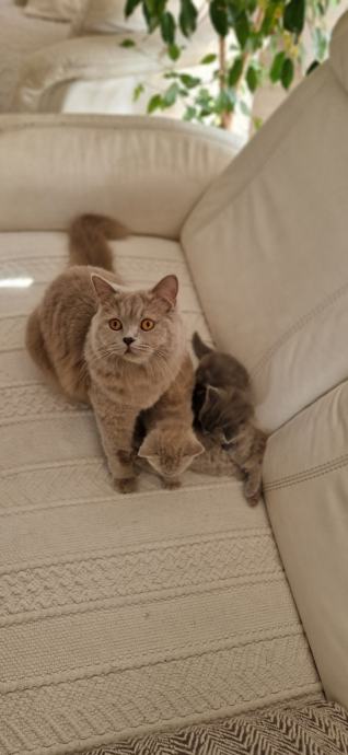 Starši sta čistokrvni britanski mački [mama je dolgodlaka lilac barve, oče pa kratkodlaki favn barve], oba sta veterinarsko pregledana in zdrava, mama z mladiči živijo z nami