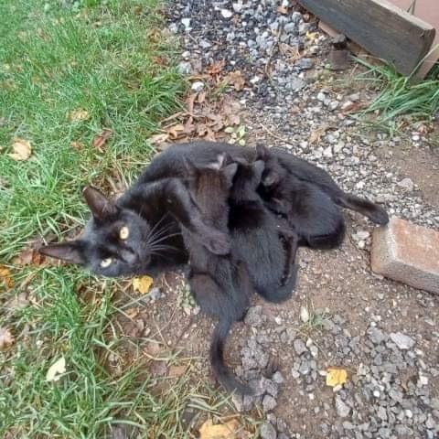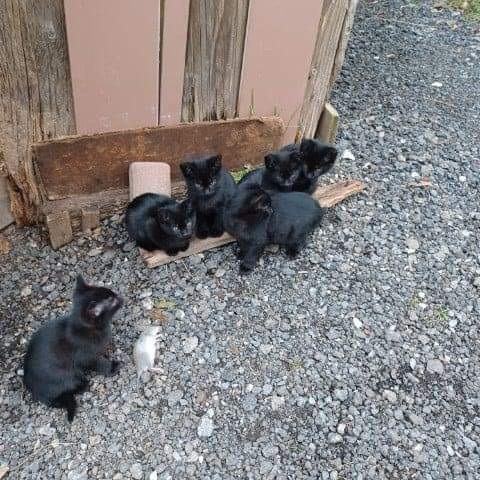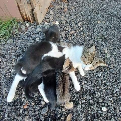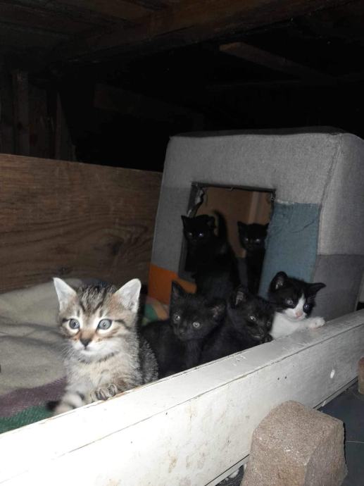 Muce zapuščene s strani lastnikov. Mamica že ima nov dom ki jo čaka ko se mladički oddajo. Nov varen dom išče še 6 mačjih mladičev. Skotene 14.09.2023.