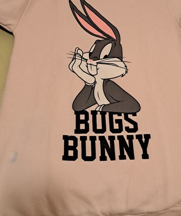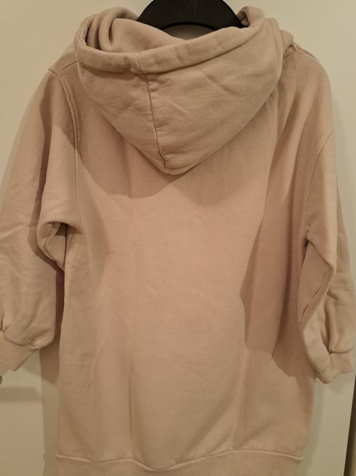 Malo nošen pulover s kapuco. Barva je svetlo roza, malo na bež. Pulover je lepo ohranjen, samo spredaj pri sliki ima en flek (verjetno od nalivnika). Je daljši in je bolj tunika. Hrbtna dolžina je 64 cm.