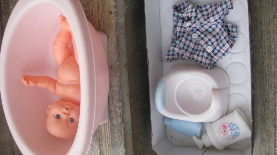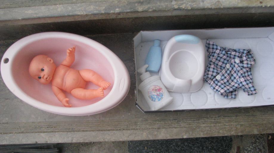 Igrača banjica za kopanje + dojencek za ceno 15ev, zraven podarim dodatke na sliki....oblekica, krema+milo , kahlica, brisačka....
