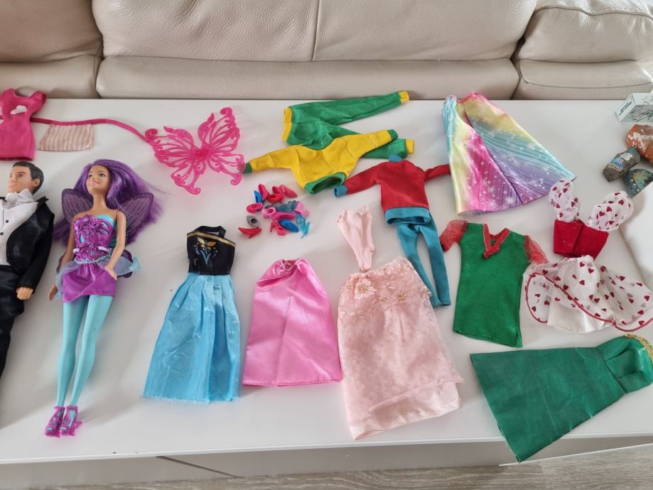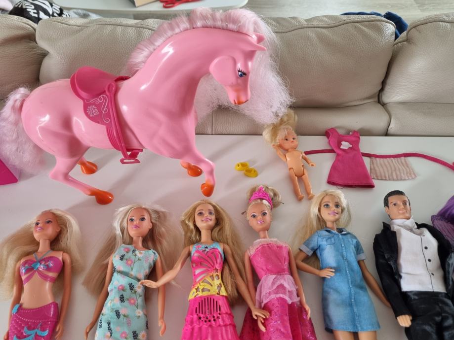 V kompletu prodam več punčk Barbie, konjička, kuhinjo z dodatki, barbie kolo, voziček za dojenčka, več kenov, oblačila in čeveljčke, kovčke z dodatki, glavničke in ostale pripomočke.