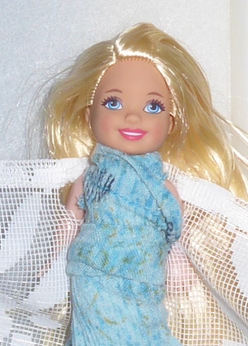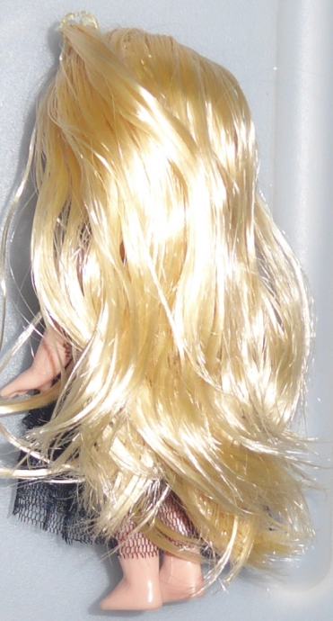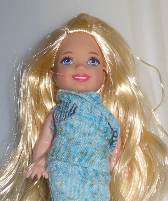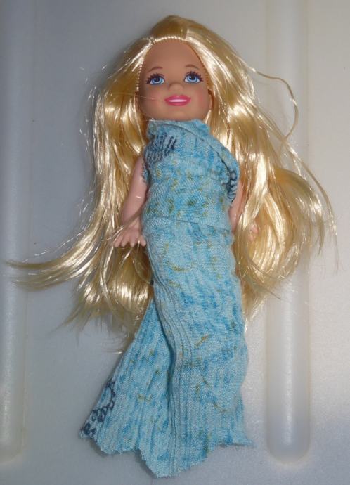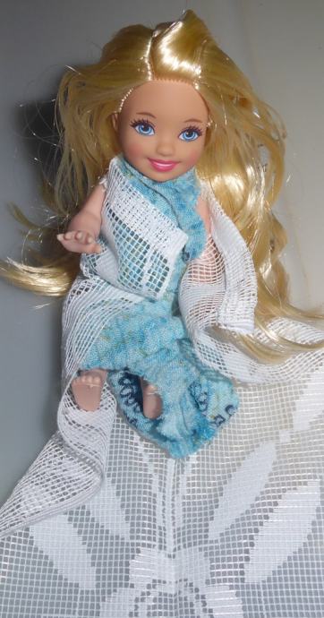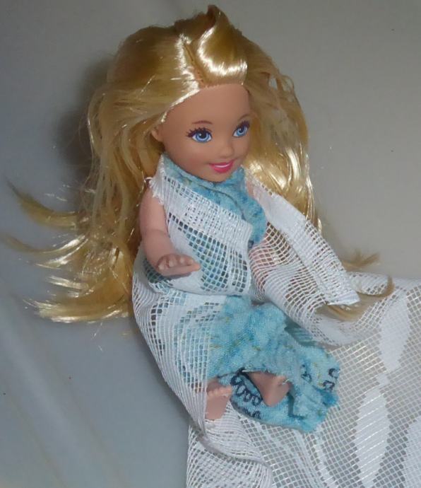 Barbika otrok, velik ca. 10,5 cm z zelo dolgimi, svetlimi lasmi. Noge, roke, glava so premične. Odlično ohranjena, kot nova. Nosi doma narejeno oblekico, oblečena je kot Elza iz Frozen.