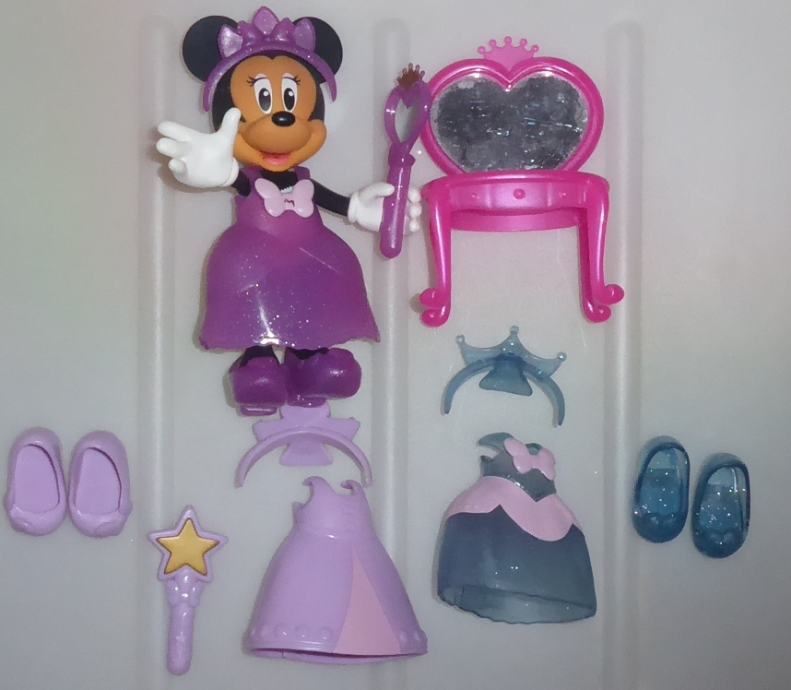 - rahlo prozorno vijoličasto oblekico, ujemajoče čevlje, tiaro z mašnico in ročno ogledalo (Minnie jo lahko drži),