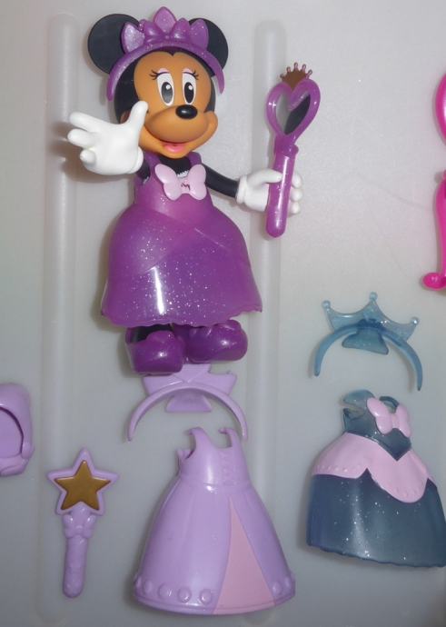 - svetlo vijoličasto oblekico, ujemajoče čevlje, tiaro s srčkom in zvezdico na palici (Minnie jo lahko drži v roki kot čarobne palice),