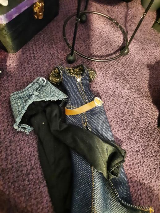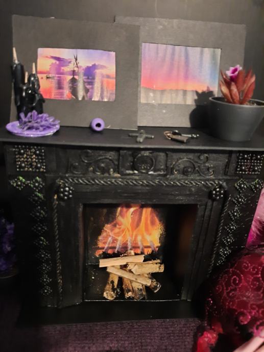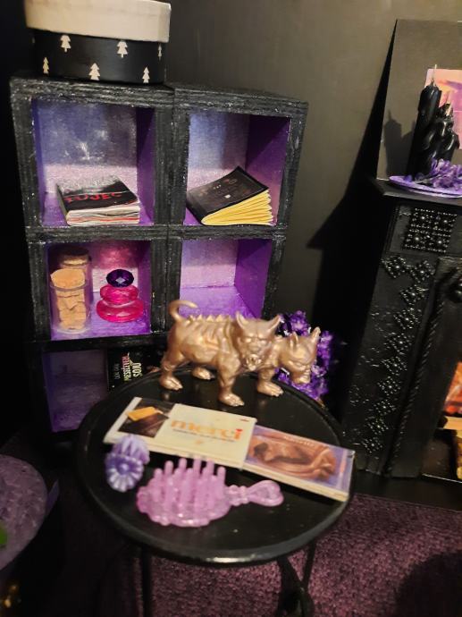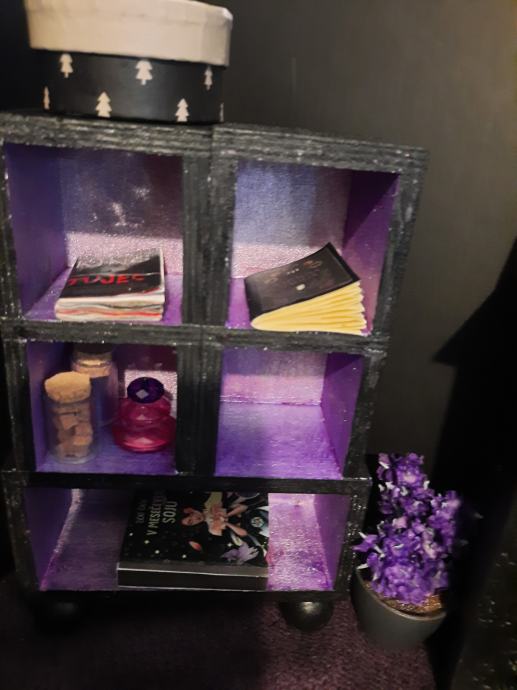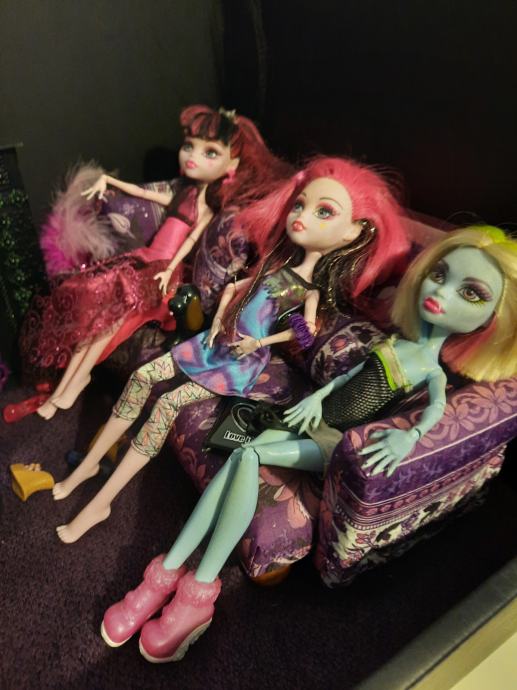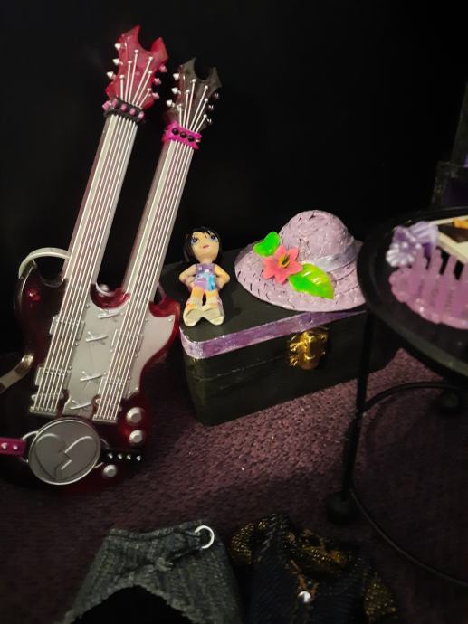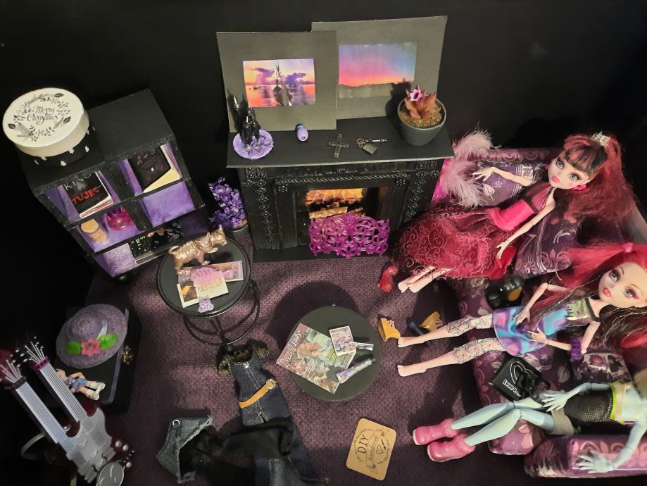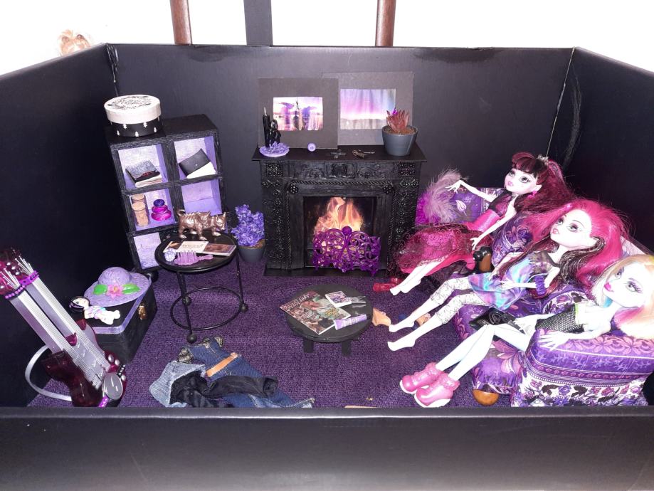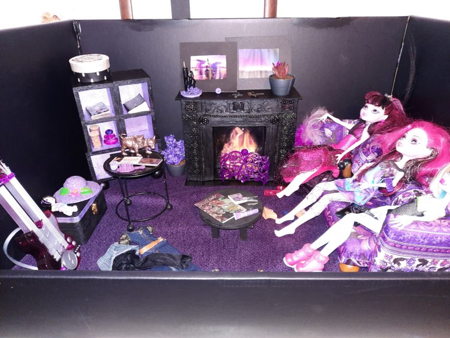 Ročno izdelana soba za punčke Monster v črno vijolični kombinaciji. Vsebuje tapiciran kavč iz blaga, kamin, knjižno omaro, dve mizici, skrinjo ter 3 punčke Monster. Poleg pa še 2 dodatni originalni oblekici in vse drobne dodatke na sliki.