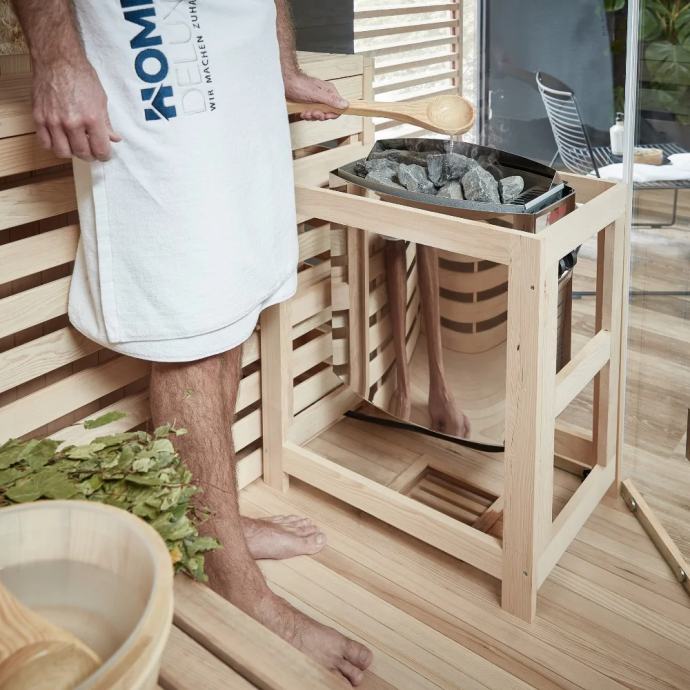 Srce te savne je močan grelec (8 kW) finskega proizvajalca Harvia. A ni le pečica tista, ki blesti z najvišjo kakovostjo. Mojstrovina je tudi visokokakovosten les jelke iz Kanade v stenah savne. Premišljena obdelava tega plemenitega materiala ne zagotavlja le elegantnega videza, ampak tudi izjemno funkcionalnost in vzdržljivost: les jelke je eden najboljših in najgostejših lesov na svetu. Zaradi svoje naravne sestave nudi odlično toplotno izolacijo in je zato idealen za sisteme savn. Toplota ostane v savni, medtem ko zunanja plast ostane blizu sobne temperature. Ta lastnost preprečuje opazne izgube toplote in nepotrebno porabo energije. Zato v vseh naših savnah uporabljamo les jelke in druge visokokakovostne materiale. Obdelava zunanjega lesa z dvojnim temeljnim premazom in barvanjem daje savni daljšo življenjsko dobo v primerjavi z mnogimi drugimi savnami. Les v notranjosti je namenoma ostal neobdelan.