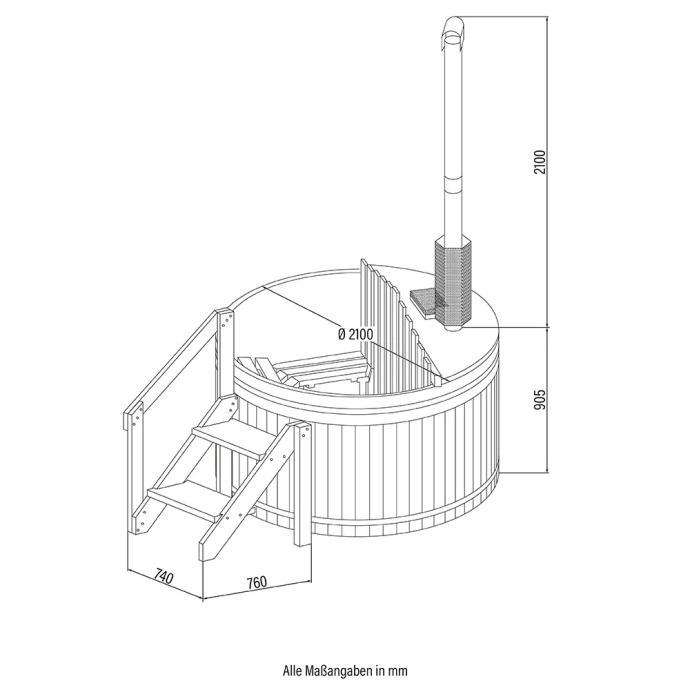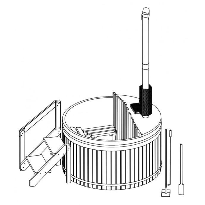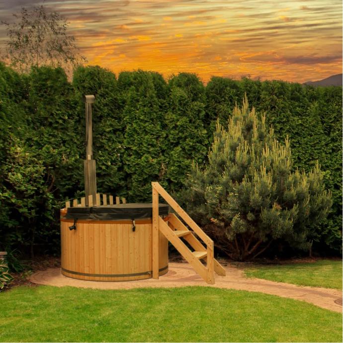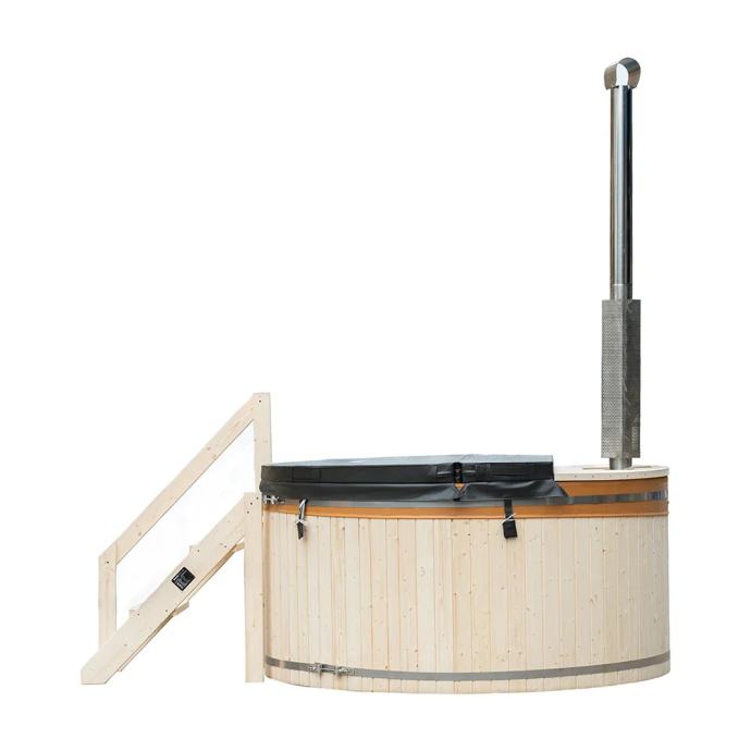 Zaradi sodobnega dizajna v kombinaciji z elegantnimi in skandinavskimi poudarki je visokokakovosten zunanji bazen privlačen. Zmogljiva peč na drva v zelo kratkem času ogreje vašo masažno kad na prijetno temperaturo za kopanje približno 30 - 40C°. Zaradi optimalne velikosti in okrogle oblike lahko masažno kad popolnoma postavite na svoj vrt in uživate v razgledu. Masivni les zunanjega opaža obljublja vzdržljivost in navdušuje s svojim modernim videzom. Notranja obloga je izdelana iz visokokakovostne in trpežne PVC folije in zagotavlja, da lesena notranjost ostane tesna in zaščitena. Zahvaljujoč udobnim lesenim klopem v masažni kadi boste izkusili maksimalno udobje sedenja.