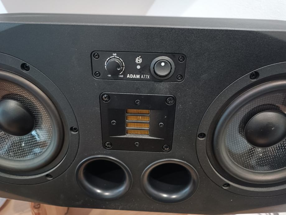 Adam A77X aktivni studijski monitor je refernčni studijski monitor vrhunske kvalitete, ki vključuje 2x100W 7-inčne karbonske zvočne membrane, 50 watni tweeter kot tudi vgrajeno nadzorno ploščo. Horizontalni dizajn prinaša "compression-free" delovanje in optimalno avdio kvaliteto za miksanje in masteriziranje. Unikaten 2 x 1/2 sistem vsebuje dve zvočni membrani ki delujeta skupaj okoli ferkvenčnega dosega 38Hz, z dodatno membrano, ki dosega 3khz za optimalno zvočno sliko. Ta dizajn pomaga eliminirati motnje v signalu in fazne probleme v srednjetonskem frekvečnem spektru ter izboljšuje celotno kvaliteto zvoka.