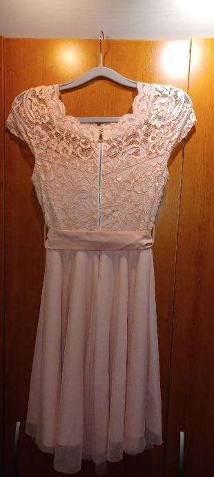 Prodam le za valeto nošeno obleko, kombinacija čipke in tila, lepe marelične barve (bolj kot na fotki). Načeloma je velikost S, vendar precej elastična, zato primerna za različne postave (na fotografijah jo ima oblečeno dekle, ki sicer nosi velikost M).
