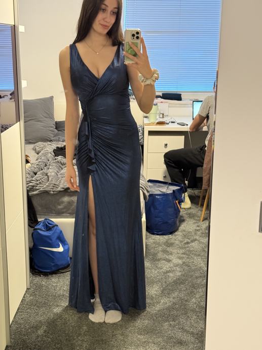 Prodajam čudovito temno modro večerno obleko, ki zaradi sijočega materiala in popolnega kroja izgleda izjemno prestižno. Obleka se lepo prilega postavi, poudari linije in je izredno ženstvena.