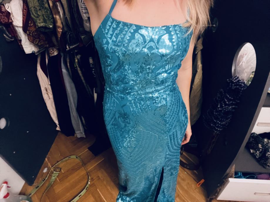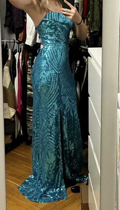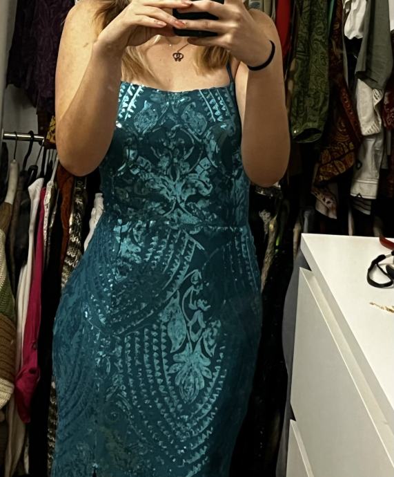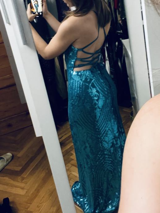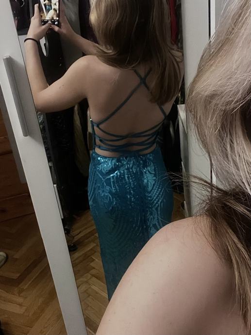 Prodajam enkrat nošeno in kot novo ohranjeno obleko, primerno tudi za maturantski ples. Zadaj se nastavljiva, zato velikost ni tako striktna. Je precej dolga in primerna za tiste višje rasti, hkrati pa pušča opcijo krajšanja pri šivilji. Možen je prevzem v živo v Mariboru ali okolici po dogovoru. Moje mere (na sliki) 155cm, 50kg, običajno