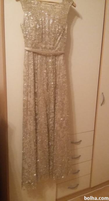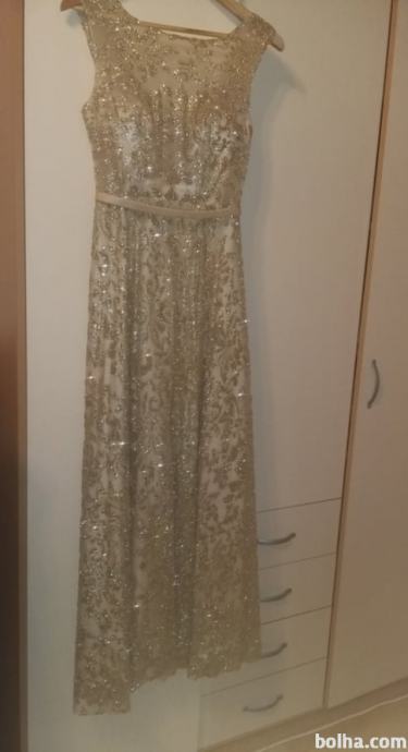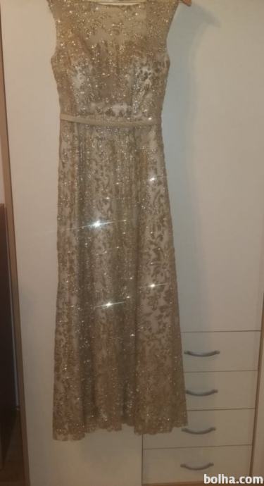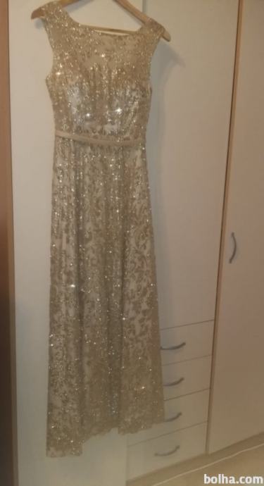 Obleka je zlate barve ter se zelo sveti. Odlično ohranjena saj je bila nošena samo enkrat na maturantskem plesu, je pa bila skrajšana tako da je primerna za dekleta velikosti do 160cm.