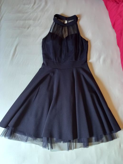 Svečana, kratka, črna obleka. A-line, zapne se okoli vratu.