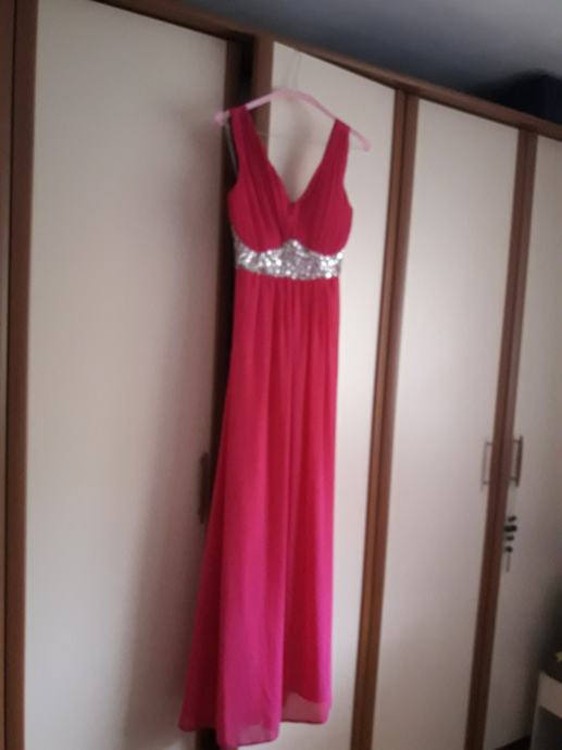 Prodam dolgo svečano obleko v roza barvi št. S. Lahko je tudi za št. M, ker je zadaj tako narejena kot je razvidno na sliki.