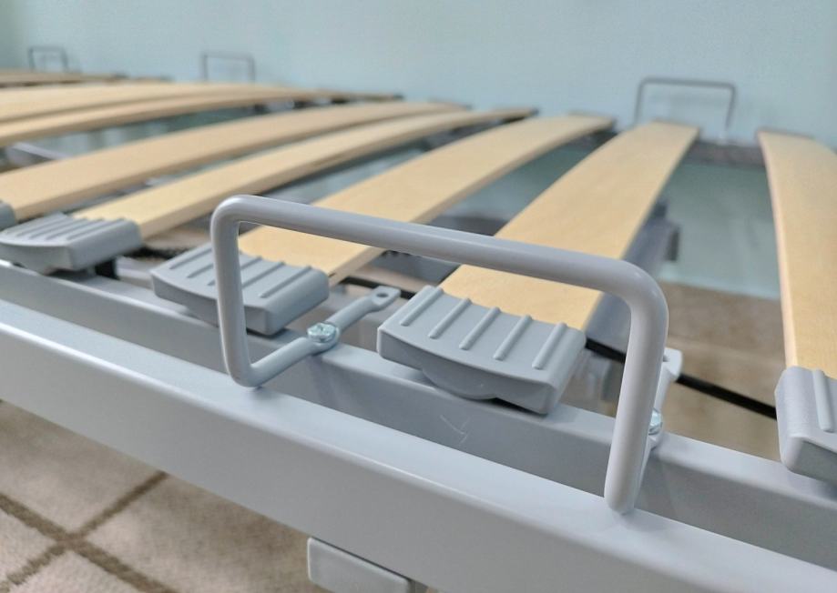 Na straneh ležišča se nahaja 6 nastavljivih kovinskih ročajev, ki preprečujejo nezaželeno premikanje posteljnega vložka. Celotna kovinska konstrukcija postelje je kakovostno obdelana, zatesnjena z elektrostatičnim postopkom in kvalitetnim prahom iz poliestra v sivi barvi, kar zagotavlja dolgo življenjsko dobo in odpornost proti obrabi.