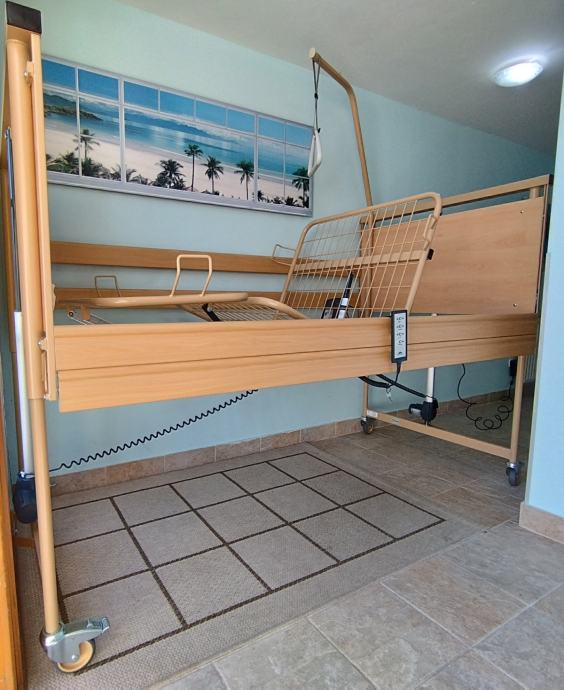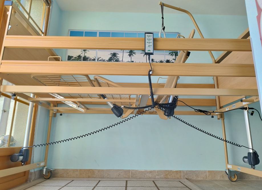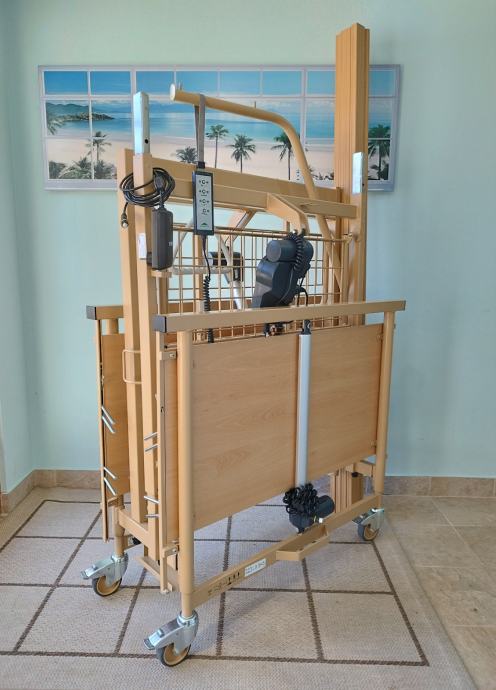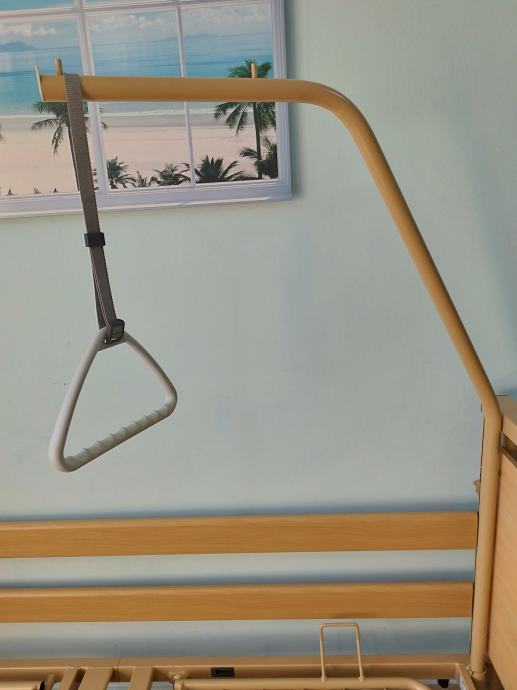 Električna negovalna postelja s vključenim pripomočkom za obračanje in dvigovanje - vogalnim trapezom s trikotnikom na zanki. Možno ga je namestiti v konzolo ob levi ali v konzolo ob desni strani vzglavja. Trapez je premičen, zanka trikotnika pa je nastavljiva po dolžini.