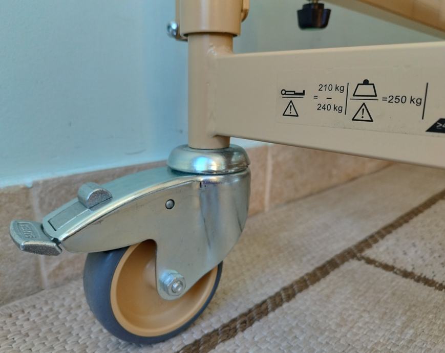 Negovalna postelja je postavljena na štirih robustnih in vrtljivih "Tente" kolesih, premera 100mm. Vsako kolo se vrti v krogu 360° okoli svoje osi, kar omogoča enostavno premikanje postelje. Za preprečitev premika in fiksno pozicijo postelje v prostoru, ima vsako kolo vgrajeno nožno zavoro.