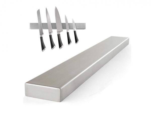 Magnetno držalo nožev. V celoti iz nerjavečega jekla. Zaobljeni robovi ter skriti vijaki za pritrditev.