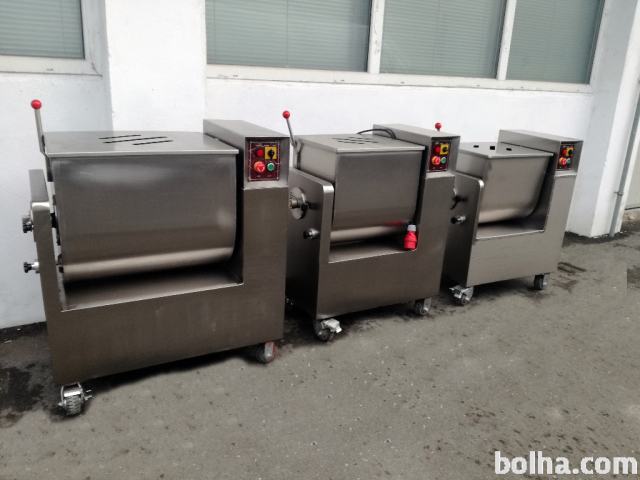 Mešalec za mešanje mesne mase,(klobase, salame,) v celoti izdelan iz nerjavečega inox materiala. Za lažje in bolj učinkovito mešanje poskrbi nagibna posoda, katero je mogoče nagniti v katerikoli položaj. Mešala so v celoti odstranljiva, kar pripomore k lažjemu čiščenju. Mešalec je opremljen še s kolesi in pokrovom. Ustreza vsem HACCP kriterijem.