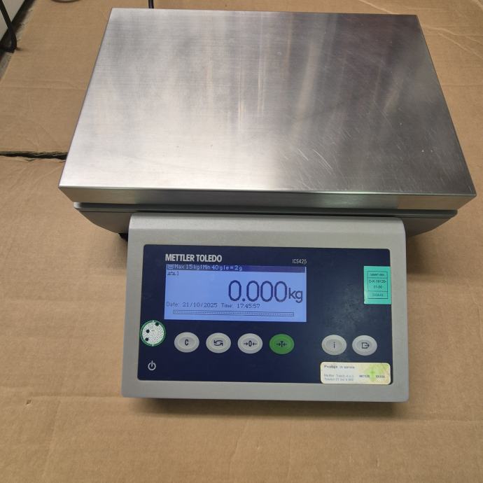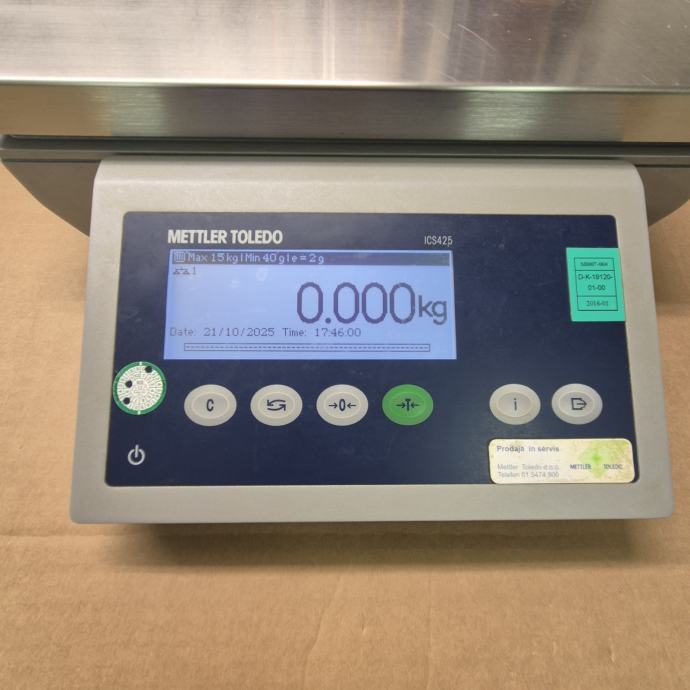 PRODAM RABLJENO PROFI TEHTNICO ZMAMKE METTLER TOLEDO ICS425S-15, V ODLIČNEM STANJU. MOŽEN PRIKLOP PREKO KABLA NA PRINTER ALI RAČUNALNIK. OBMOČJE DO 15Kg DO 2g NATANČNO, PRIKLOP 230V. ROBUSTNO ALUMINIJ OHIŠJE, MATERIALI PRIMERNI ZA UPORABO V INDUSTRIJI. SERVIS IN REZERVNI DELI ZAGOTOVLJENI V SLOVENIJI. CENA NOVE JE PREKO 2000€.