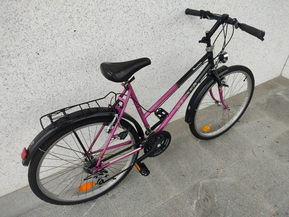 Prodamo zelo lepo ohranjeno žensko mestno kolo Rog Mountain s 26 col velikimi kolesi in 3x6 prestavami. Kolo je redno servisirano in ima vso potrebno opremo za varno in udobno vožnjo: okvir v velikosti 45, 26 col velika kolesa z ojačanimi dvostenskimi kolesnimi obroči, odsevniki in avtomobilskimi ventilčki (gume so novejše), 3x6 prestav Shimano, V-brake zavore spredaj in zadaj, LED luči na baterije spredaj in zadaj + originalna luč na dinamo, originalni sedež, zvonec in tačka.