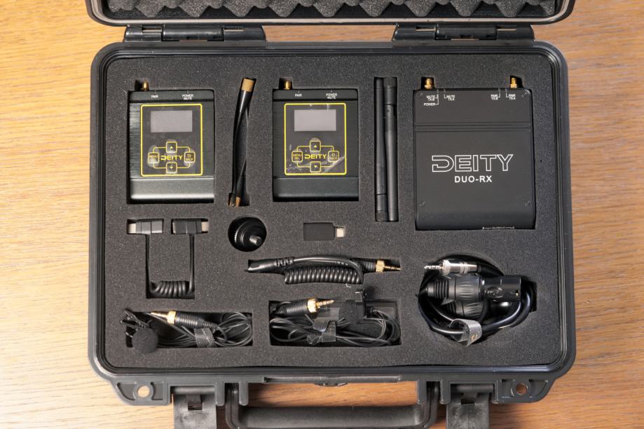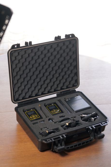 Komplet dveh lavalier mikrofonov z oddajniki in sprejemnikom, primerno za DSLR, mirrorless in ostale načine snemanja. Priloženi tudi XLR vmesniki za mešalne mize, ipd. Priložen robusten kovček za transport.