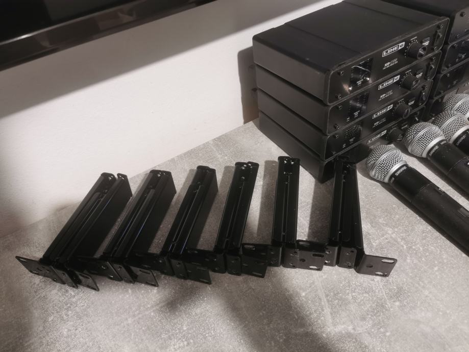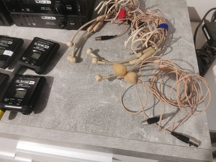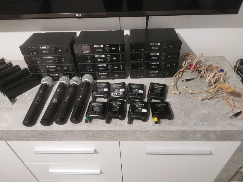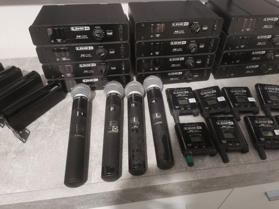 Prodam 12 mikrofon ski postaj in brezžičnih mikrofonov proizvajalca Line 6. Na voljo je 6 postaj z bodypack in naglavni mikrofonom. Za vsak par, dodam še rackmount.
