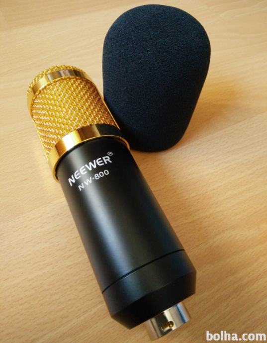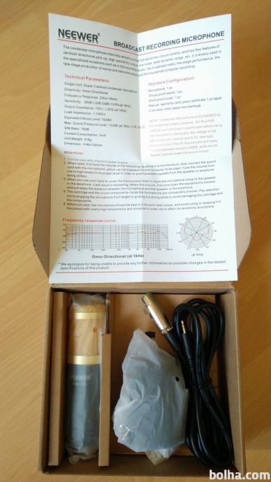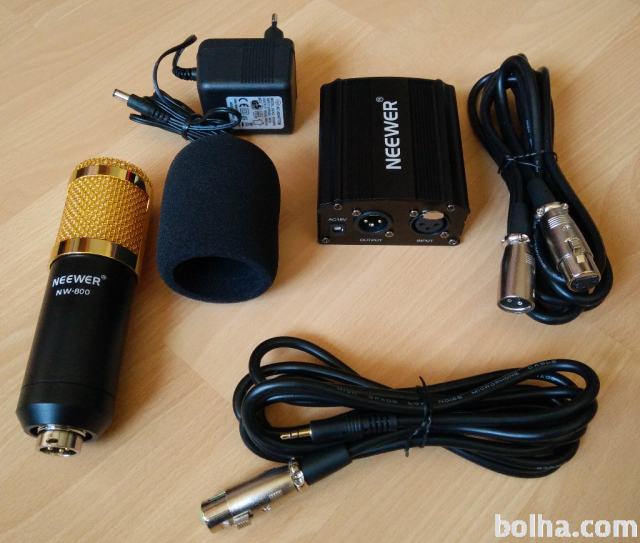 Prodam studijski mikrofon Neewer NW-800 z dodatnim napajanjem (kondenzatorski mikrofoni ga potrebujejo za normalno delovanje) in kabli. Vse je kot novo, brez praskice ali drugih znakov uporabe. Mikrofon je primeren za začetnike, saj je glede na ceno zelo kvaliteten. Kupljen je bil v začetku januarja 2019.