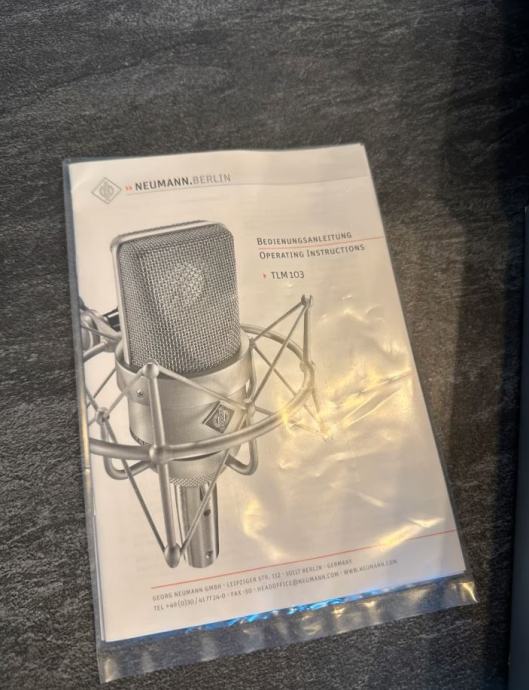 Neumann TLM 103 mt, skupaj z originalnim blažilcem tresljajev EA1, zapakirano v originalni škatli. Barva: mat črna.