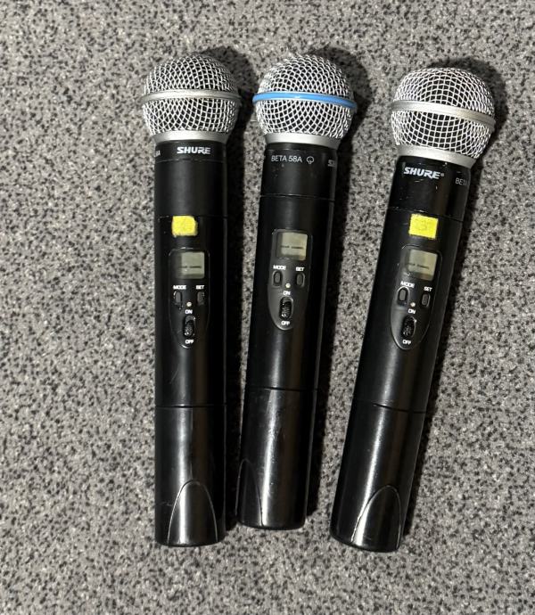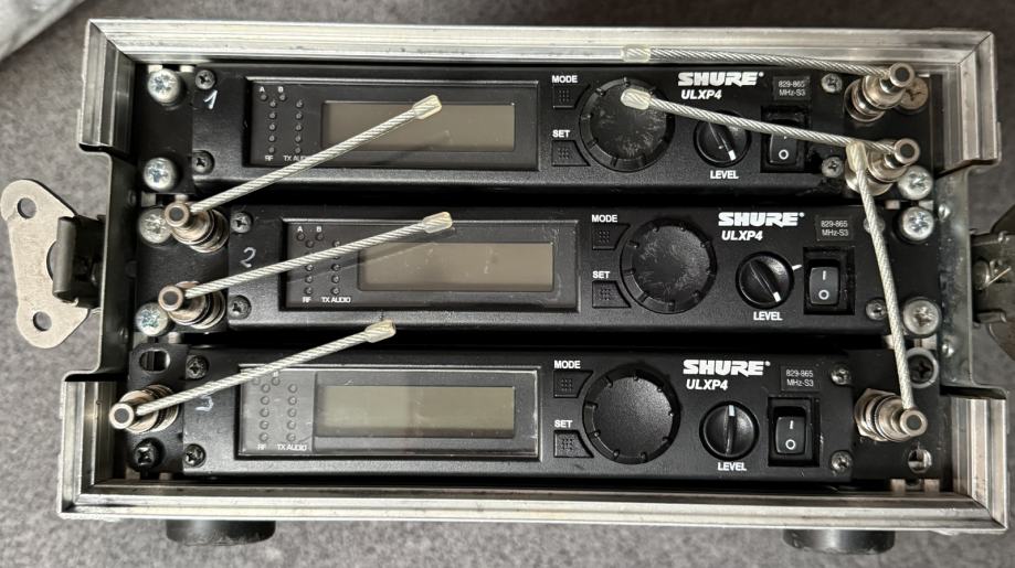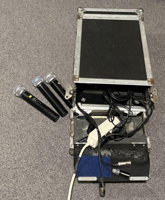 Brezhiben sistem treh mikrofonov Shure ULXP4 z Beta 58 glavami in sprejemniki. Vse skupaj v custom made racku, kjer so trije sprejemniki, pripravljene antete, elektrika (razdelilec) in 3x XLR.