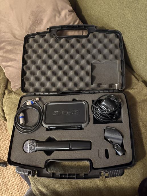 Komplet vsebuje SHURE PGX4 reciever, PGX2 mikrofon (SM58), kovček, adapter in nastavek za mikrofon.