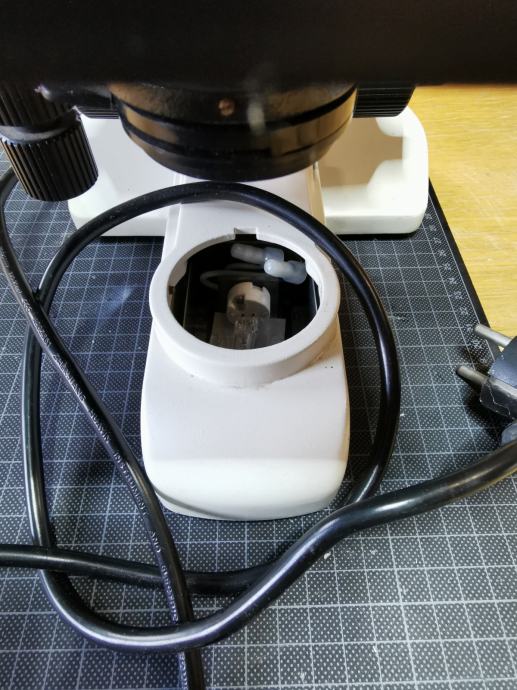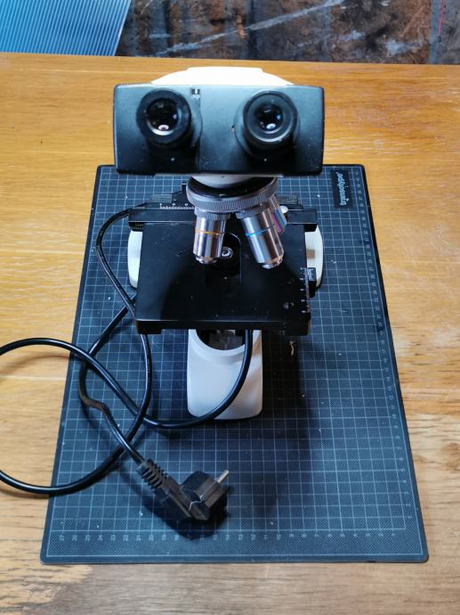 Prodam mikroskop viden na slikah. Predvidevam, da mora biti nad lučko leča ali kaj podobnega - tega ni bilo zraven. Prav tako manjka držalo za primerke, ki je nekje založeno in ga bom priložil.