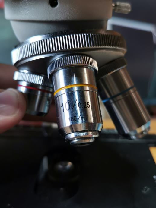 Okular 10x, objektivi 4x, 10x, 40x, 100x.